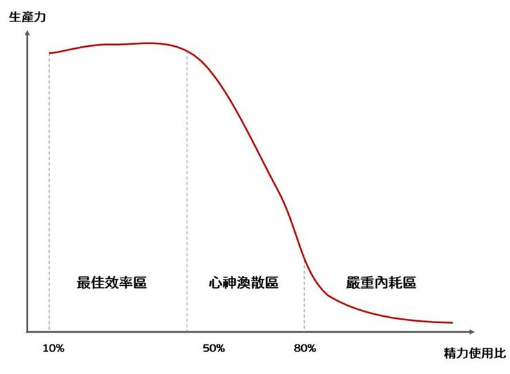 前陣子我畫了一張談論生產力與精力之間的關係,我需要控制的是讓自己的精力維持在一個低使用量,避免自己進入心神渙散區與嚴重內耗區。(參考我 Facebook 的貼文)