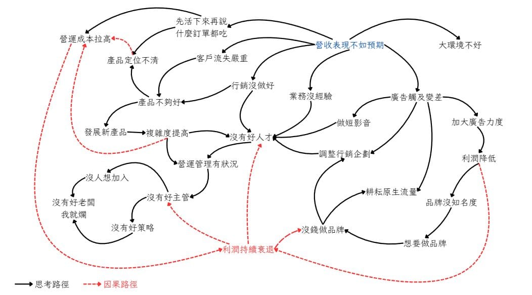 「黑色實線」是他在解決問題時的思考路徑,也是過去他曾嘗試過的方法,「紅色虛線」則是因果線,代表事情的前因後果。