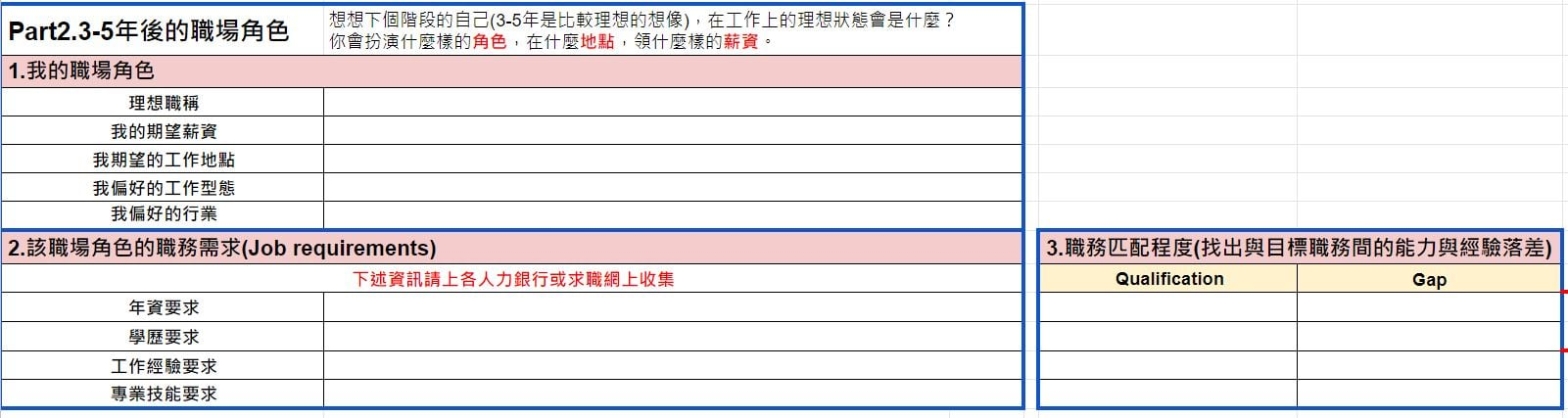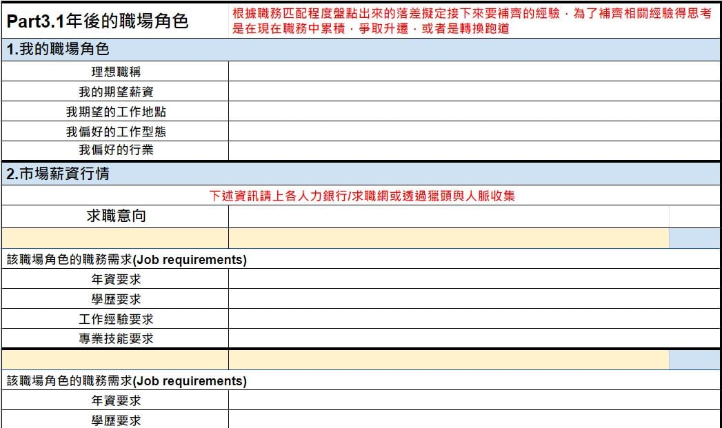 未來履歷的基本概念並不複雜,但做起來也需要花上不少時間,以下三張表單供大家參考,你可以按格式去思考。