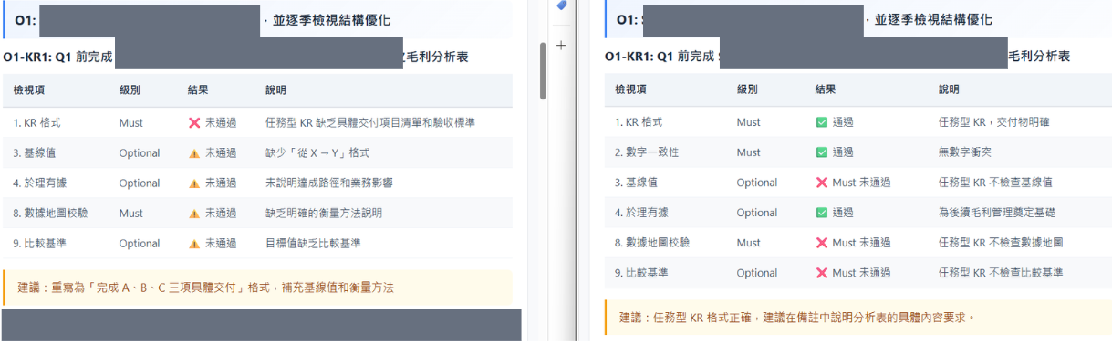 但同樣的內容,在兩次執行過程中給出的結果卻有極大的差別,雖然兩者最後都需要再調整 KR 的內容,但要改的地方卻有極大的差異。這就偏離了我想要的結果,這結果不一致。