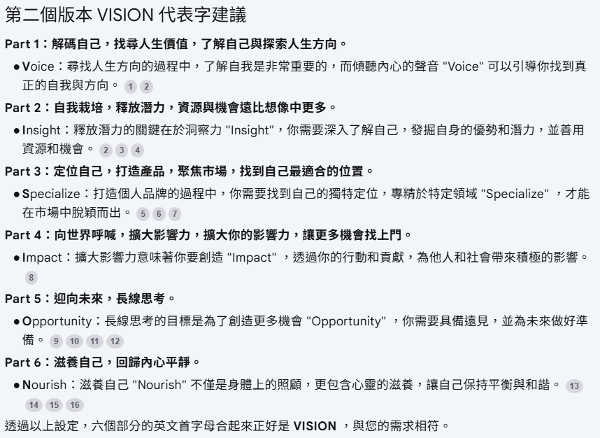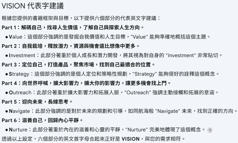 我在寫書過程中,為了優化想法,我請 NotebookLM 給出的建議。我給了他大綱,然後請他幫我為每個部份找一個代表英文字,每個部份的英文字的首字結合在一起要是 VISION。他產生的又快又好,讓我很快地產生了新的想法。