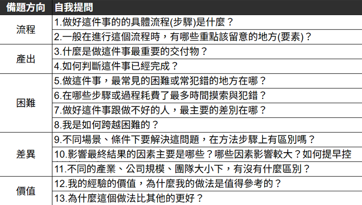 這一點相對複雜,一般我會用我另一堂課程中使用的「知識萃取13問」來進行解構。13 問的內容如下,提供大家參考,細節有點太多,在此就不多做贅述。不過這一段也是系列文要展開內容細節的關鍵,有機會再跟大家分享。
