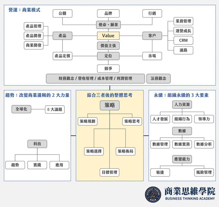 這堂課一開始的「世界觀」如下,當初我在規劃花了不少時間,因為這是一門將我認為重要的商業知識拆解開。每個區塊再往下展開一到兩層,最後產出 200 多篇的文章主題,每個主題最少要深入到一定程度,不能只是流水帳帶過,因為我需要的是聽得懂、學得會、用得上。如果只是看到一個很有趣的案例,這對多數人的商業知識不會有幫助。