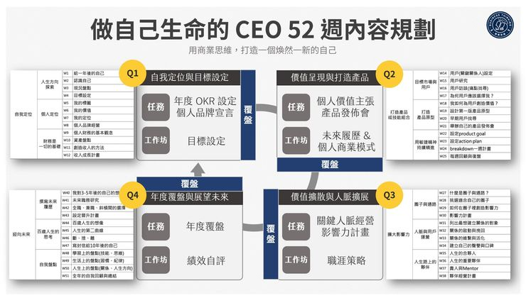 學院內另一門由我主講的課程《做自己生命的CEO》,這是 52 篇內容,一週一個主題與練習,單元與單元間有先後順序。這堂課的內容之所以這樣規劃,是因為就我經驗,很多人生問題其實卡關都不在怎麼做的問題,而是「為什麼要做」的問題。