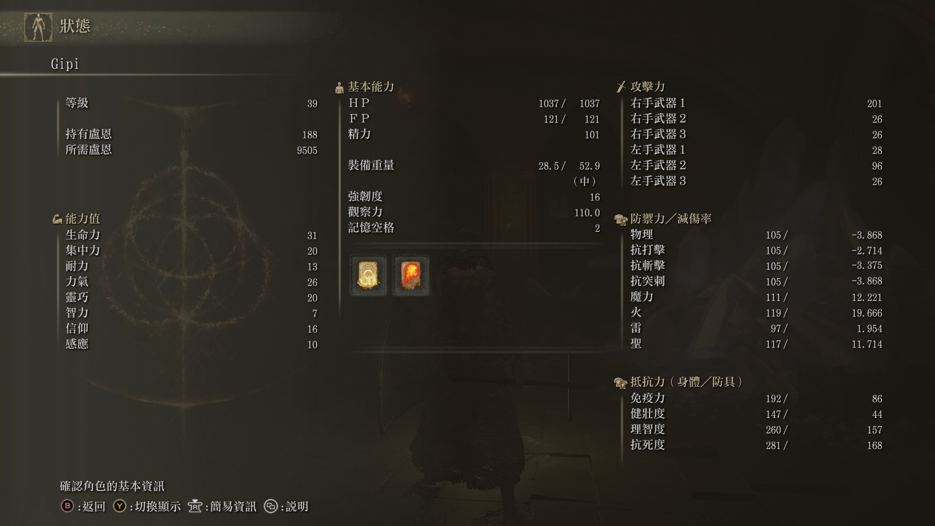 可是為了玩近戰,就不得不穿比較厚重的鎧甲,所以我需要配置更多點數在集中力跟耐力,加上二周目之後的怪攻擊力提升了不少,本來的生命力已經不夠用了,所以不得不將一部分的點數也配置在生命力上。