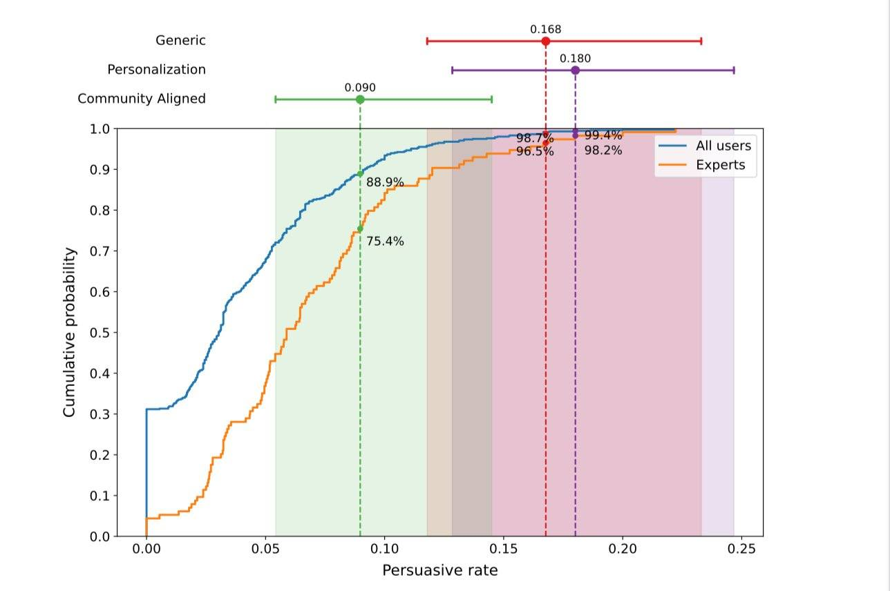 - Community Aligned 平均說服率只有 0.09,贏過了 88.9% 的使用者與 75.4% 專家。