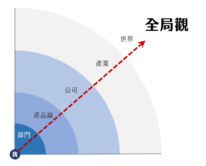 這個從個人到部門,到產品,到公司,到產業,再到世界的路徑,就是我所謂的全局觀。