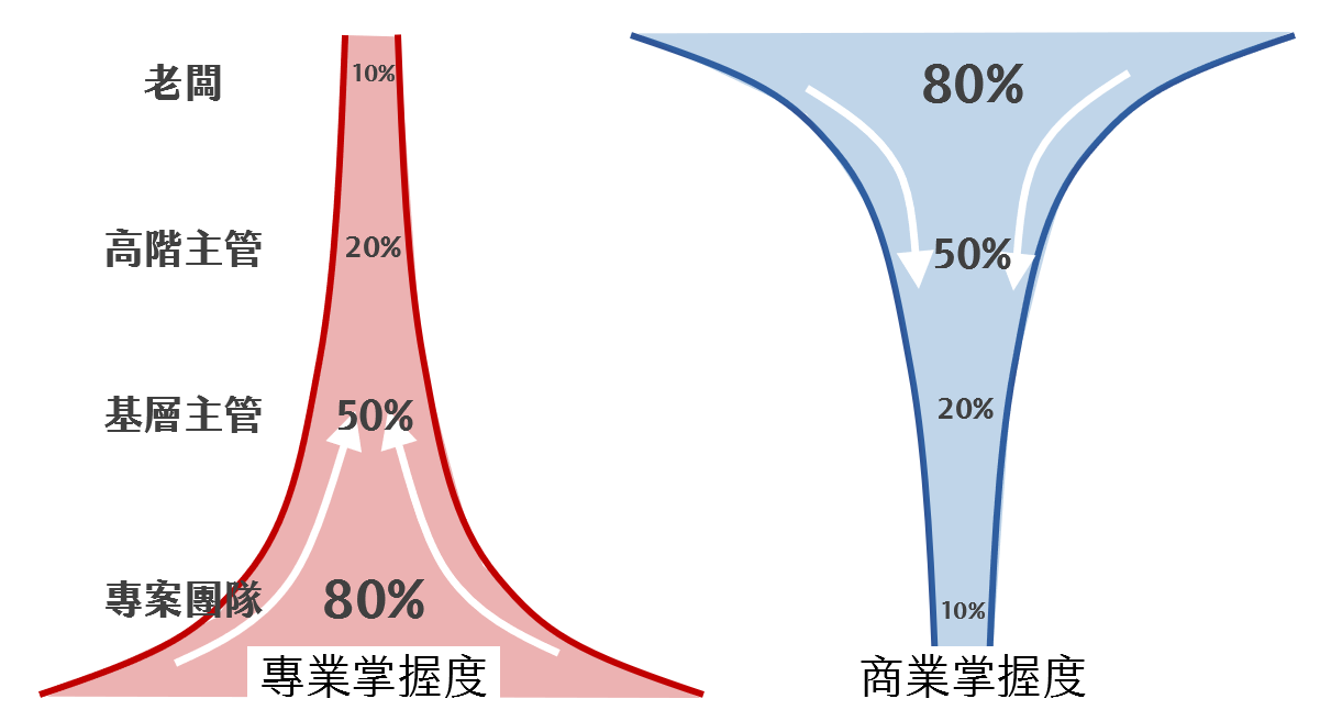 世界快速變化的情況下,組織高層的經驗適用性正快速降低,但這些人卻要做出專業性的決策,而對專業把握度最高的那些人,對商業卻一竅不通,所以直接將決策權交給基層員工似乎也不是一個恰當的方法。