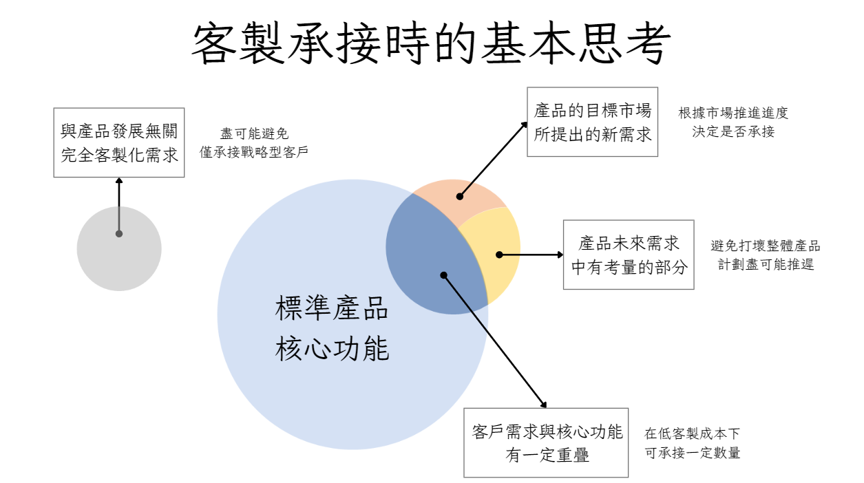 早期基於多重原因,不論是為了找到 Product-Market Fit,又或者為了先有營收,企業總會承接或多或少的客製化訂單。這無可厚非,但隨著時間推進創辦人可能會發現,客製化訂單較容易成交,因此在銷售行為上不期然漸漸偏向客製化,而非標準產品。